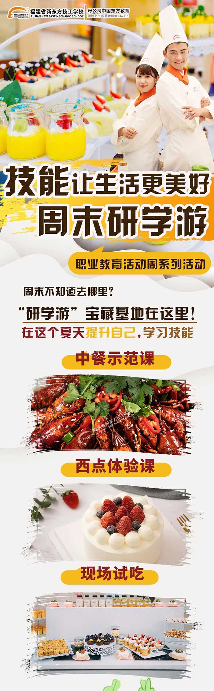 为了帮助家长孩子更好的了解福建新东方,了解中餐、西点专业的学习情况,我校特推出“周末研学游”活动,此次活动分为三个模块: