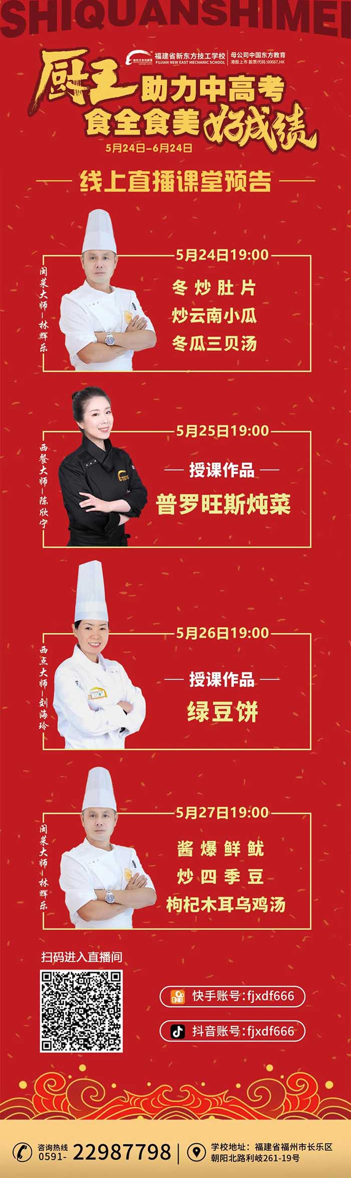 一年一度的中高考即将到来,一日三餐饮食问题备受家长关注,为助力初高中学子金榜题名,我校将开展“厨王助力中高考·食全食美好成绩”为主题的直播活动,精心烹制营养餐,助力学子夺得佳绩!