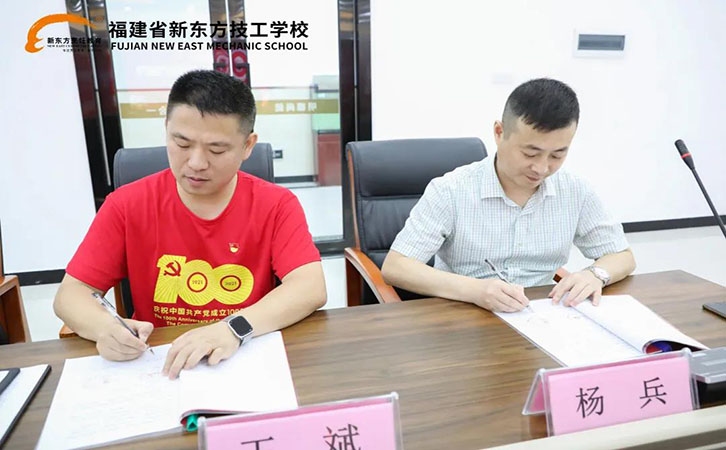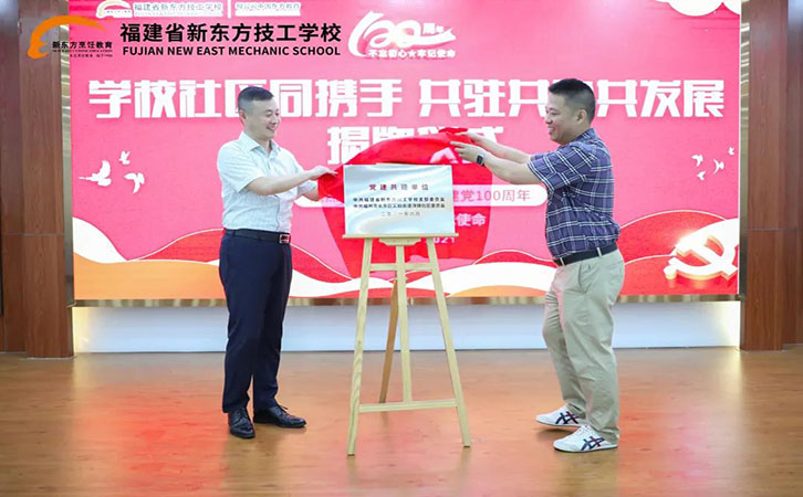 福建省新东方技工学校本着“互相学习、资源共享、优势互补、携手共进”的原则,不断强化共建单位的联系与合作,以党建为引领,开启更深层次、更广范围的校村、校社交流合作。2021年6月29日上午,福建省新东方技工学校隆重举行“学校社区同携手,共驻共建共发展”签约及揭牌仪式。