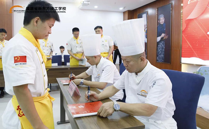 为了让技艺更好的传承,让优秀的学生得到更多的学习机会,福建省新东方技工学校专门成立了中餐专业雏鹰训练营和西点专业菁英训练营。通过学校教学领导的带领,许建老师、林辉乐老师在学校的教研工作中做出了突出贡献,由他们为中餐专业雏鹰训练营的同学们签名赠书。